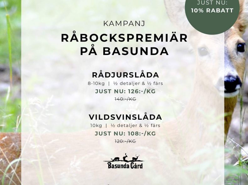 Det är precis vad vi tänkte göra! Vid den natursköna sjön Björkerns strand i Kinda ligger Basunda gård.  På gården finns ett fint gårdsslakteri med godkända lokaler där de slaktar tamboskap och vilt. De har även ett vilthägn med dov- och kronhjortar. Vi har gjort en beställning med leverans direkt till Stockholm nu i September, lådorna kommer vakuumförpackad och frysta, väl märkta! Om ni är intresserade att få en leverans samtidigt, just nu till specialpris kan ni kontakta mig på info@kardemummagumman.se eller ta kontakt direkt med dem (info@basunda.se) och begär samfrakt med mig! 🙂