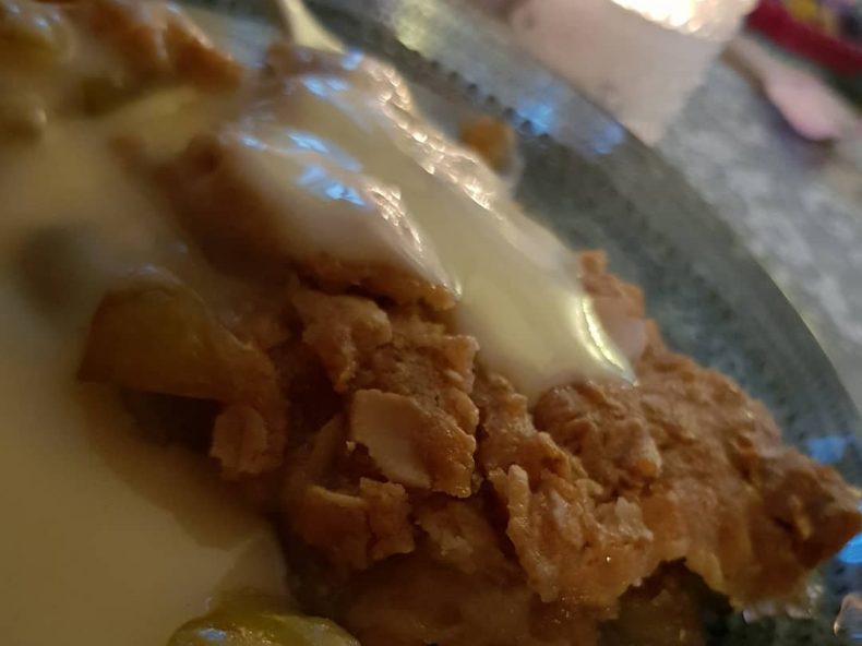 Lägg smör, grädde och sirap i en kastrull och värm upp och låt puttra 2 minuter. Blanda sedan ner de torra ingredienserna. Bred ut smeten över frukten och sätt in i ugnen ca 45-55 minuter så den får fin färg. Låt sedan svalna en stund och servera med vaniljglass.