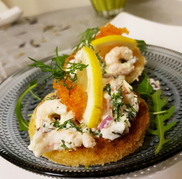 Toast skagen med creme fraiche och majonäs
