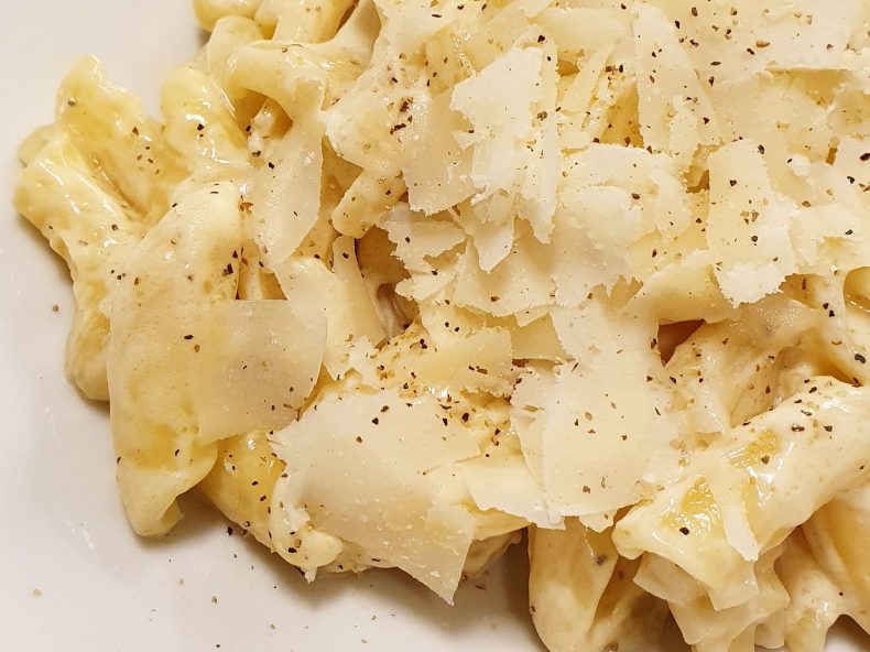 Rör ner pastan i såsen. Servera med riven parmesan och svartpeppar.