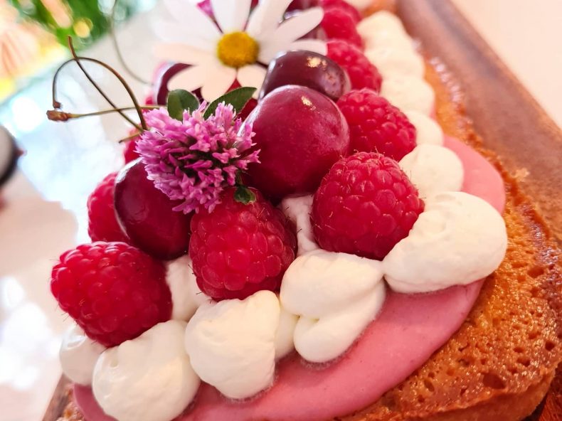 Vispa ihop till en slät glasyr och bred ut över den avsvalnade kakan. Spritsa på grädden och dekorera med bär.