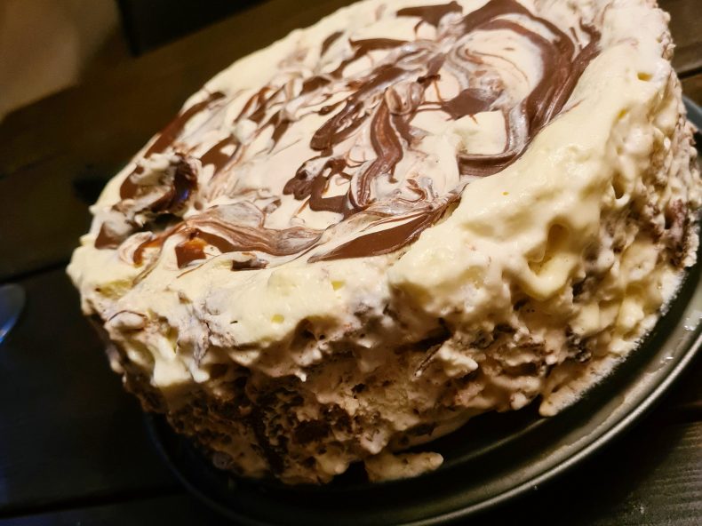 Lägg den första marängbotten där, krossa sedan den andra i en skål, vänd ihop äggvitor, äggula och grädde och blanda i hop med marängkrosset. Ringla ner den ljumna nutellan, går bra att värma i micron några sekunder. Fyll upp formen med denna blandning. Blir någon smet över kan man göra portionsformar och frysa in. Ställ sedan in hela glasskakan i frysen i minst 5 timmar innan servering.