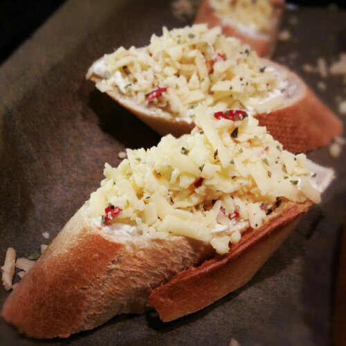 Lägg ugnen på 175 grader, bred vitlöksosten på varje snitt, blanda övriga ingridienser och lägg en liten hög på varje snitt! In i ugnen tills osten fått färg, ca 10-15 minuter.
