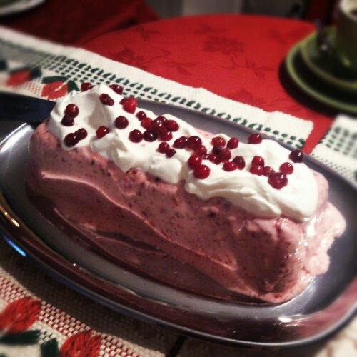 Blanda yoghurt och vaniljsocker i grädden. Blanda ihop skummen under lätt omrörning. Häll lingonblandningen i parfaitblandningen och rör om försiktigt. Fukta en ring- eller parfaitform med kallt vatten. ( eller klä in en avlång kakform med ”gladpack”, lätt att stjälpa ur formen då!) Formen ska vara 1,8liter.