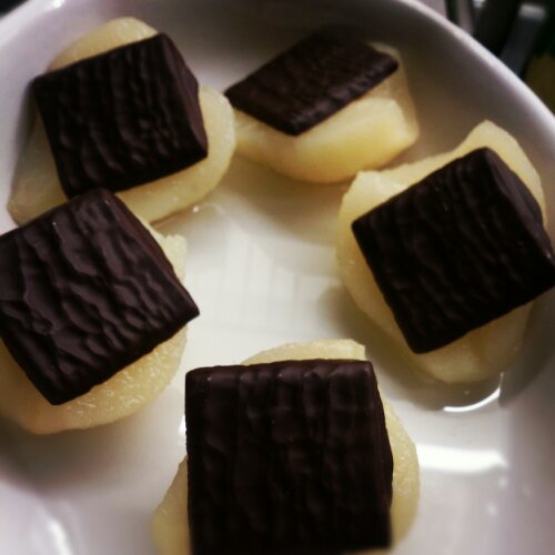 Konserverade päron med after eight på, häll lite av spadet i botten så bränner de inte fast, ugn 200 grader ca 10 minuter! Servera med glass eller grädde!