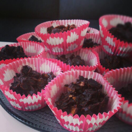 Blanda smör, sirap, socker och kakao i en kastrull. Koka till en slät massa. Tag av plattan. Häll i cornflakes och rör om. Använd en matsked för att klicka ut lagom mängd i muffinsformar. Låt stå kallt tills de stelnat.