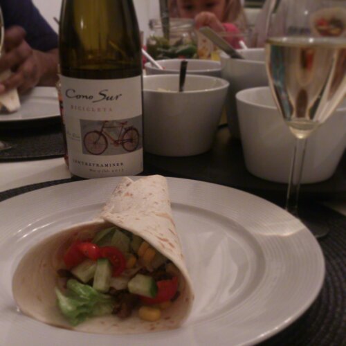 Att ibland få traska över till grannen med en flaska vin under armen och väl där bli bjuden på tacos, det svenska fredagsmyset, är riktigt skönt! 😉 Cono surs Gewurztraminer funkade även till tacos även om jag föredrar rött, Chill out tex!