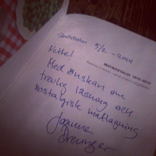 Var på en spännande kokboks release ikväll för boken Matnostalgi! Söta Joanna Drevinger som till vardags jobbar som redaktör på svenska dagbladet med mat och krogtrender som specialintresse har skrivit boken! Med många skratt och ”just ja, som mamma brukade göra förr!!” upplevelser bläddrade jag och min vän igenom boken… Och hittade massa gamla hits som förtjänar att tas ut i ljuset igen, som tex banana split, friterad camembert,hawaiikassler… Vem minns inte dem? 😀