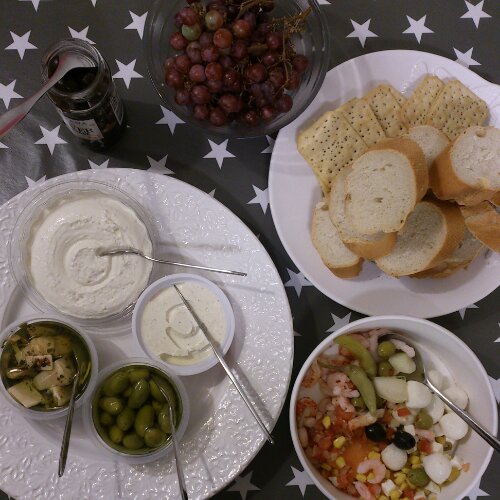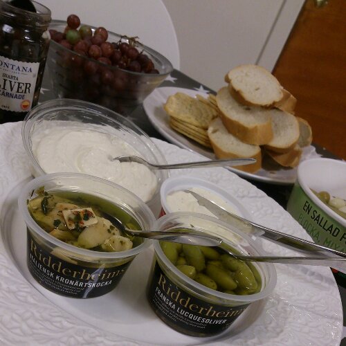 Har såå mycket att blogga om, mat, Emmis 6-års piratdisco, tips och trix.. Men ingen ork! Förkylningen har slagit ner som en blixt från klar himmel och soffan är vår bästa vän. Snacks i soffan fick det bli igår, testade lite Ridderheims nyheter, goda Oliver, Meze allioli (såå god), kronärtskocka, kex och baguette..