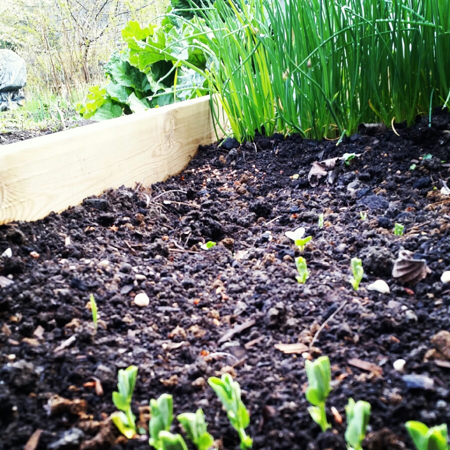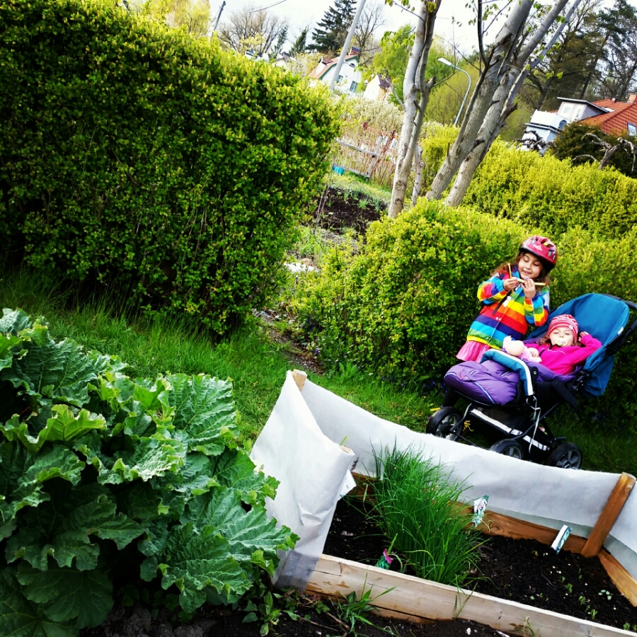En liten kvällsöversyn av kolonilotten behövs, där både det ena och det andra växer så det knakar! 🙂 Väntar att våra egna potatisar ska kika fram… Har satt en tidigt sort ”Amandine” som är en fransk delikatess potatis!