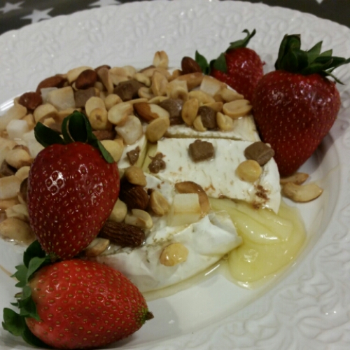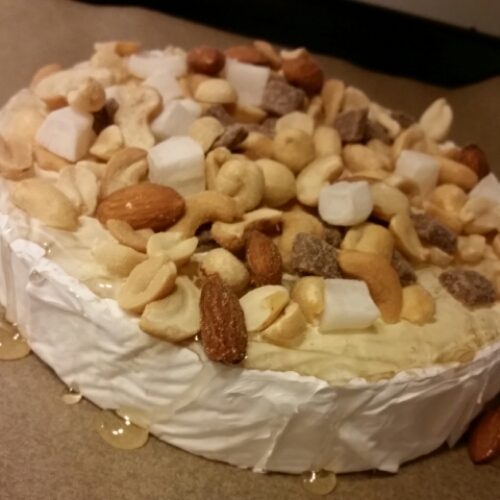 - Lägg brietårtan på en plåt med bakplåtspapper. Skär ev frukt och nötter i mindre bitar och blanda dem med honungen.