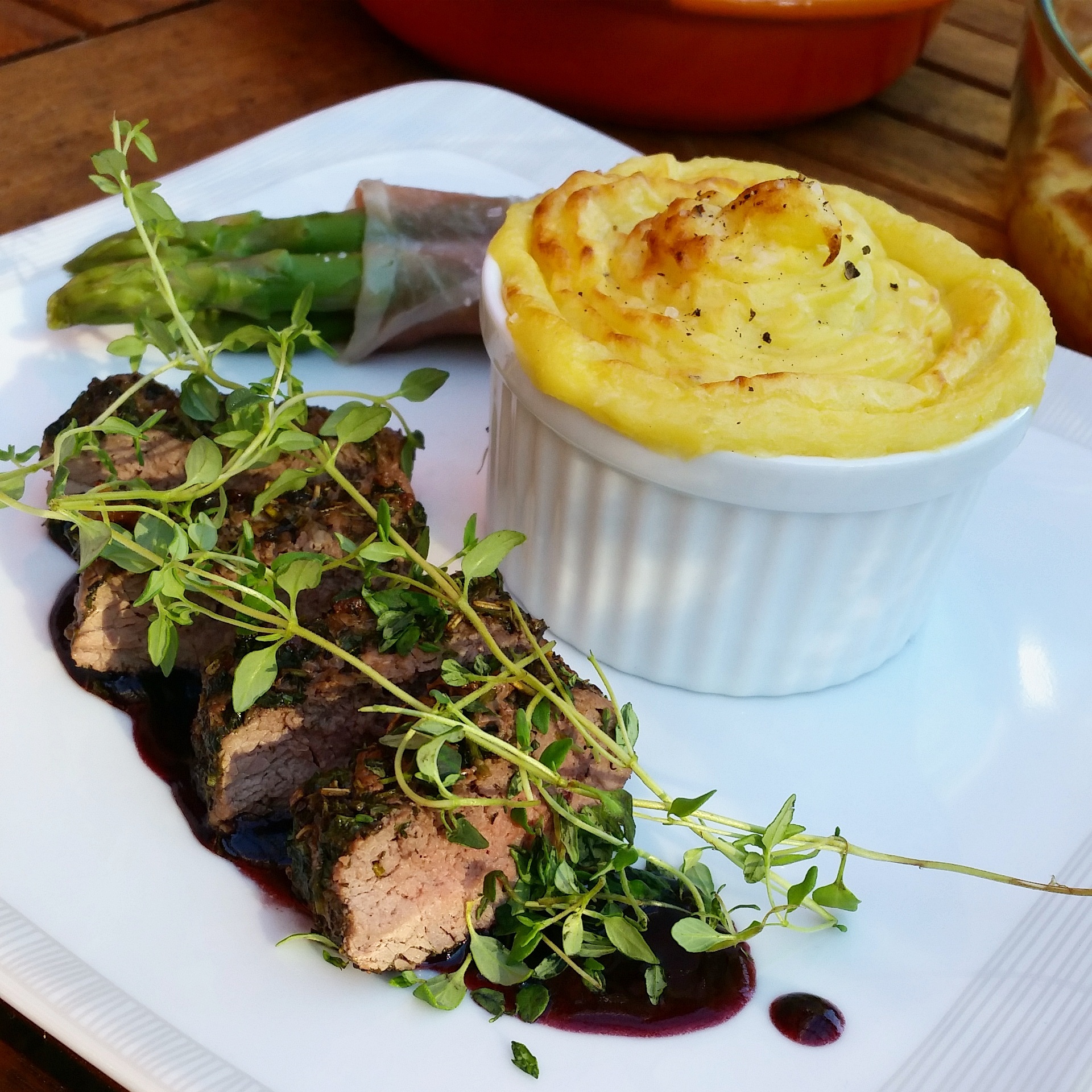 Örtbakad Lammfilé med rödvinssås, gratinerat potatismos med västerbottensost & Sparrisknyten