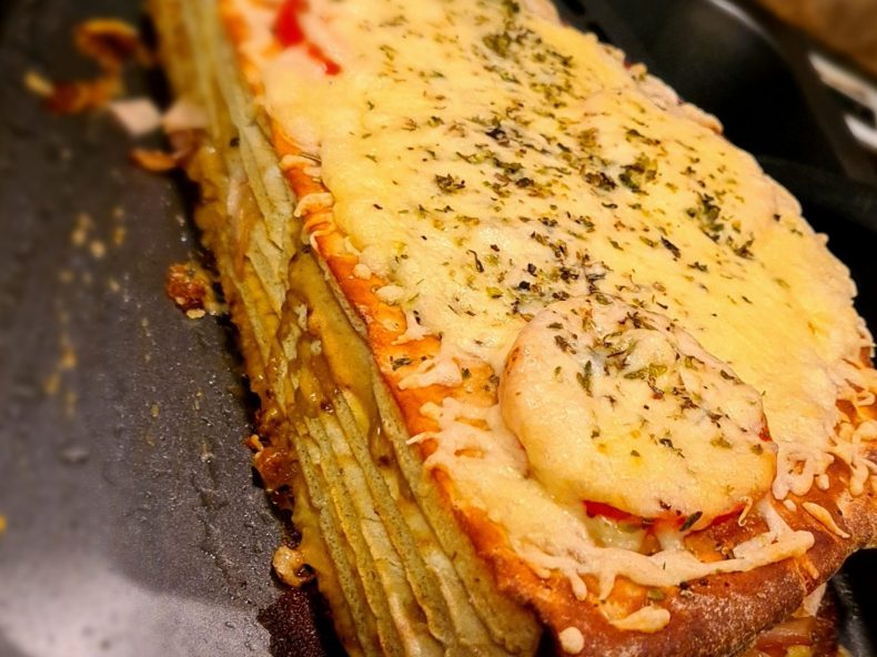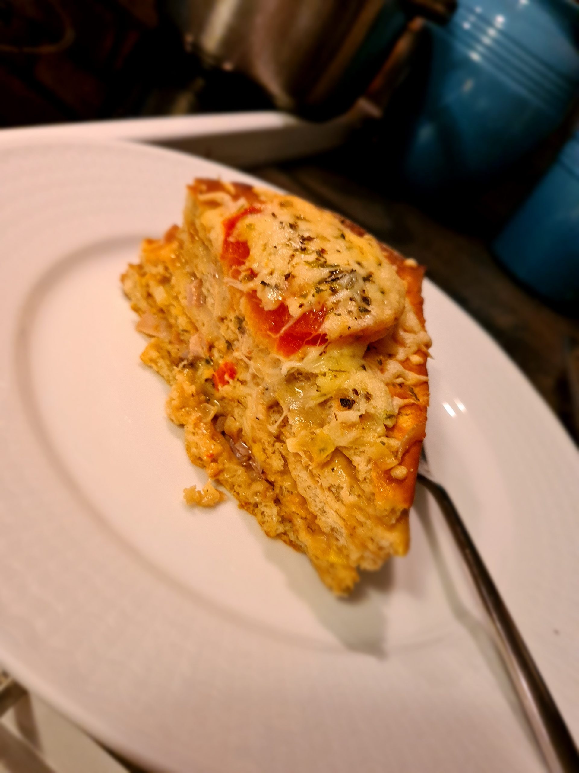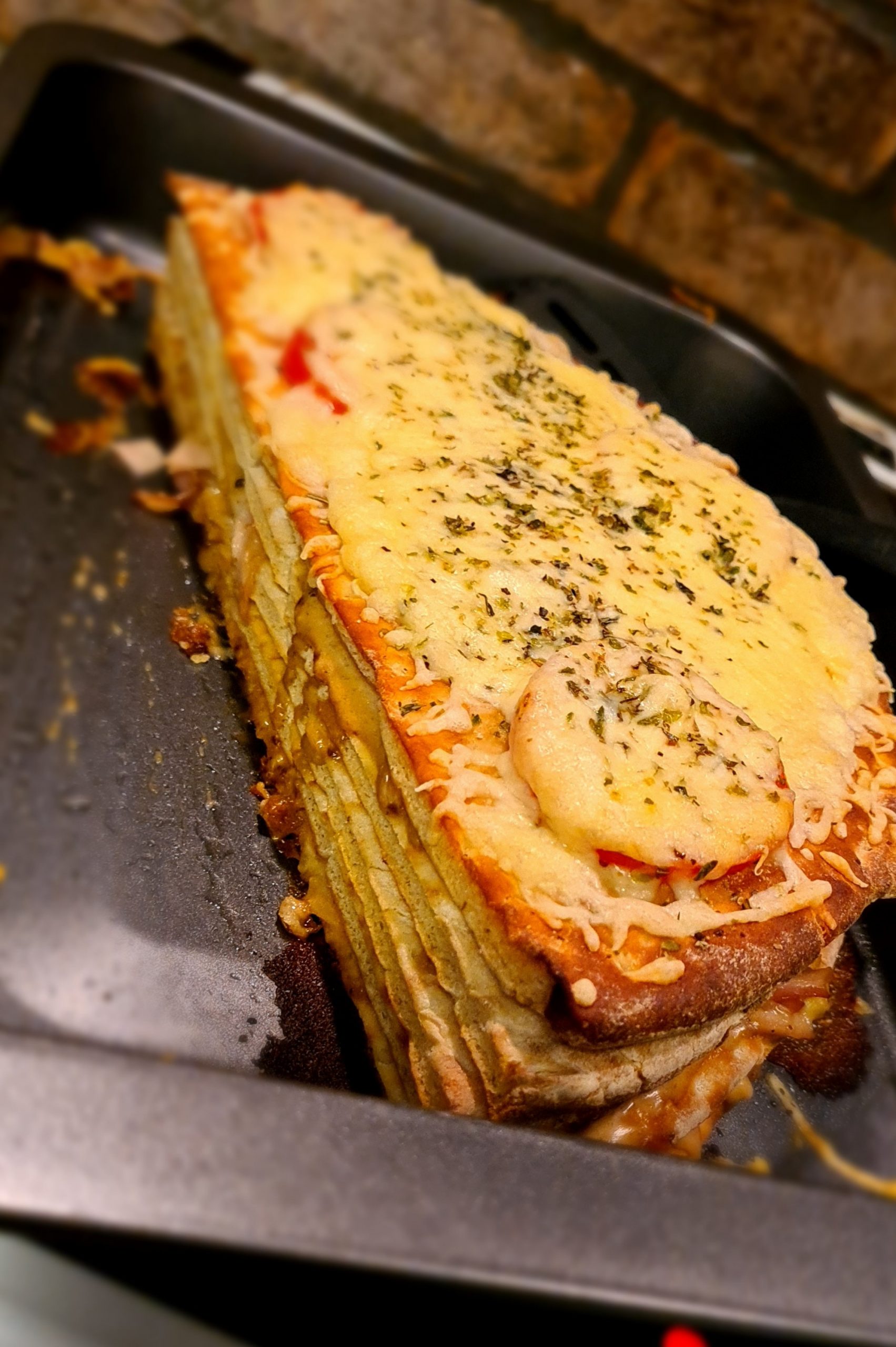 Lägg en halvmåne bröd på en plåt med bakplåtspapper. Varva bröd med fyllning.
