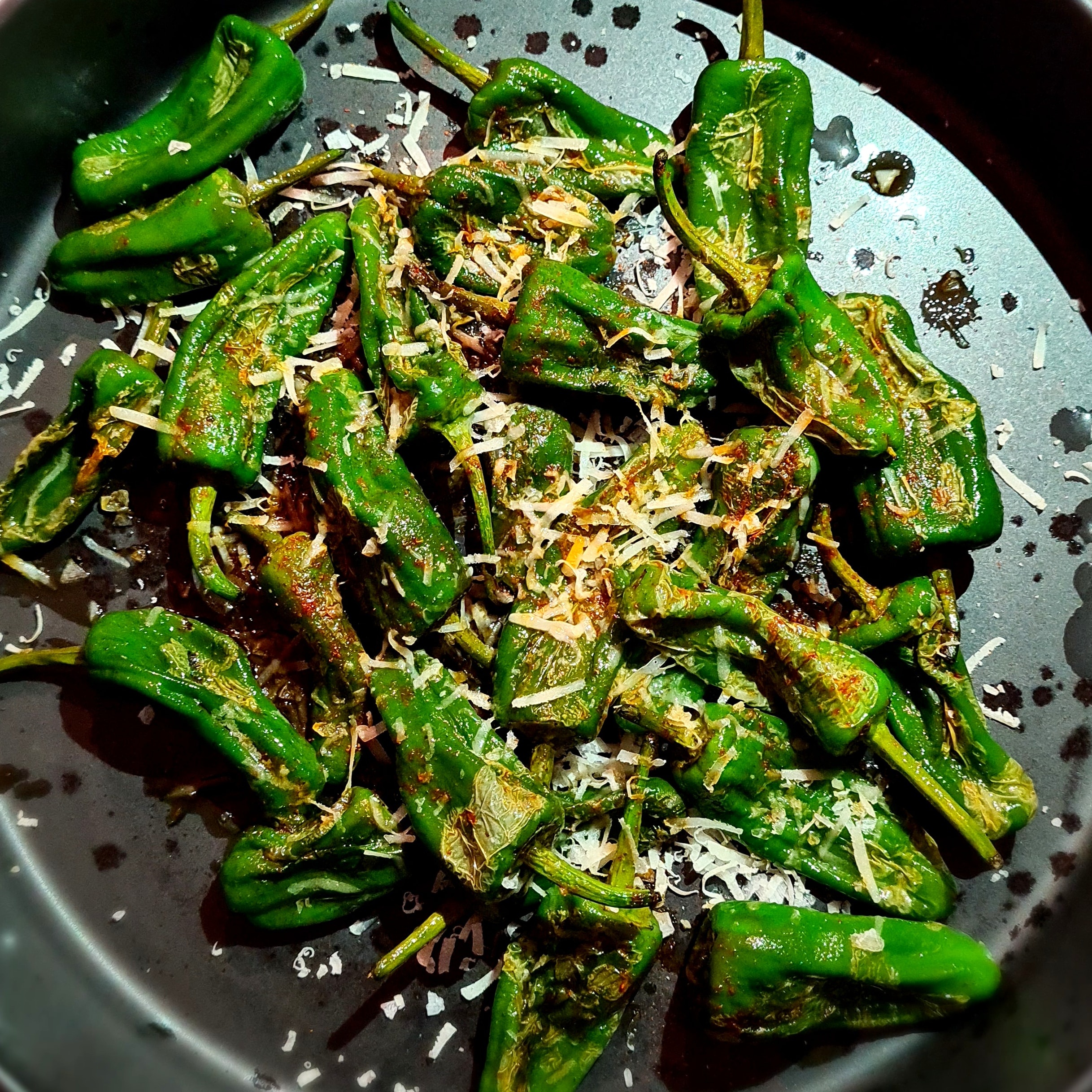 Stek de små paprikorna i oljan i en het stekpanna. De ska få rejält med färg. Rör då och då. Krydda med flingsalt.