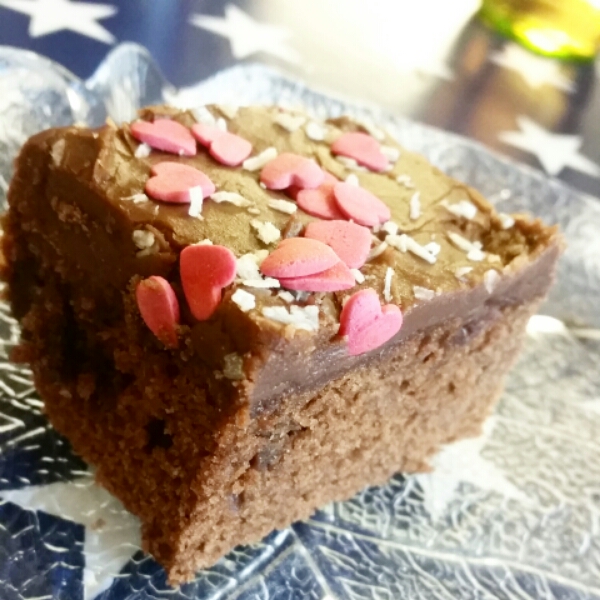 Koka under tiden upp glasyren. Smält smöret, häll ner kaffet och dra av från plattan. Rör ner övriga ingredienser. Låt kakan svalna lite och stick några små snitt med en kniv huller om buller över kakan så glasyren kan rinna ner lite inuti.  Avsluta med att strö över kokosflingor el strössel nu till alla hjärtans dag. Låt svalna innan du skär upp i rutor.