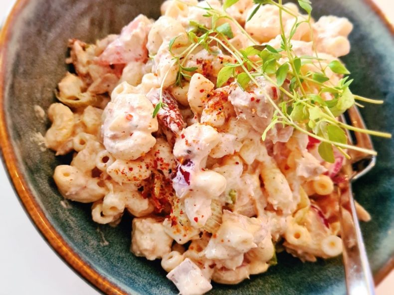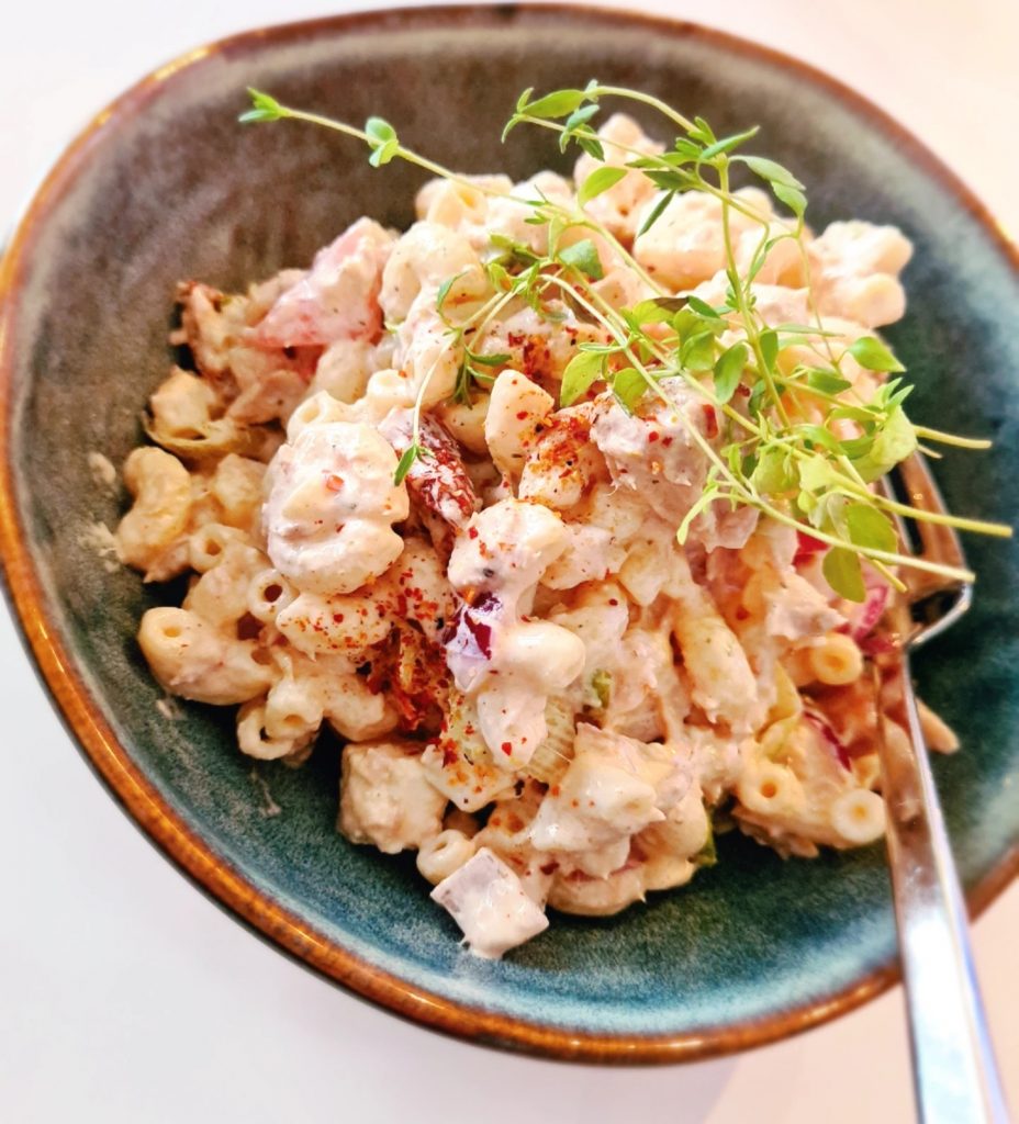 - Blanda ihop sweetchilisås, majonnäs och gräddfil. Krydda och rör ner i pastasalladen.