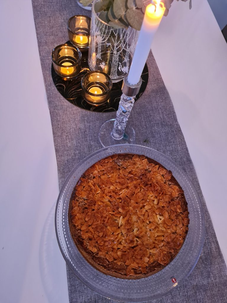 Kaka: Sätt ugnen på 175˚C. Spänn fast ett bakplåtspapper i en form med löstagbar kant ca 24 cm i diameter (för 10 bitar), eller smörj formen med smör. Smält matfettet och låt det svalna.Vispa ägg och socker pösigt. Blanda vetemjöl och bakpulver. Blanda ner mjölblandningen, matfettet och mjölken i smeten. Häll smeten i formen.Grädda kakan i nedre delen av ugnen 20-25 minuter.