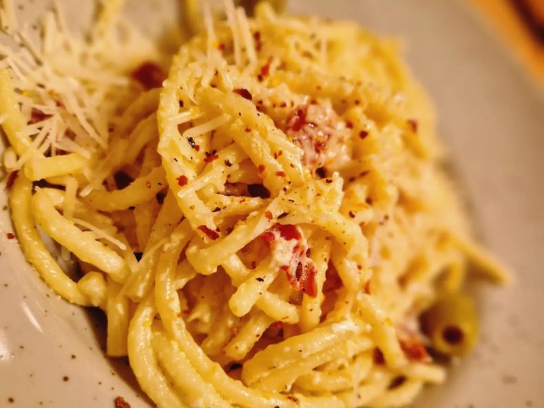- Häll över pastan i pannan. Tillsätt äggblandningen och späd med pastavattnet. Blanda allt. Såsen ska vara saftig, len och glänsande – inte grynig. Krydda med mald svartpeppar och salt.