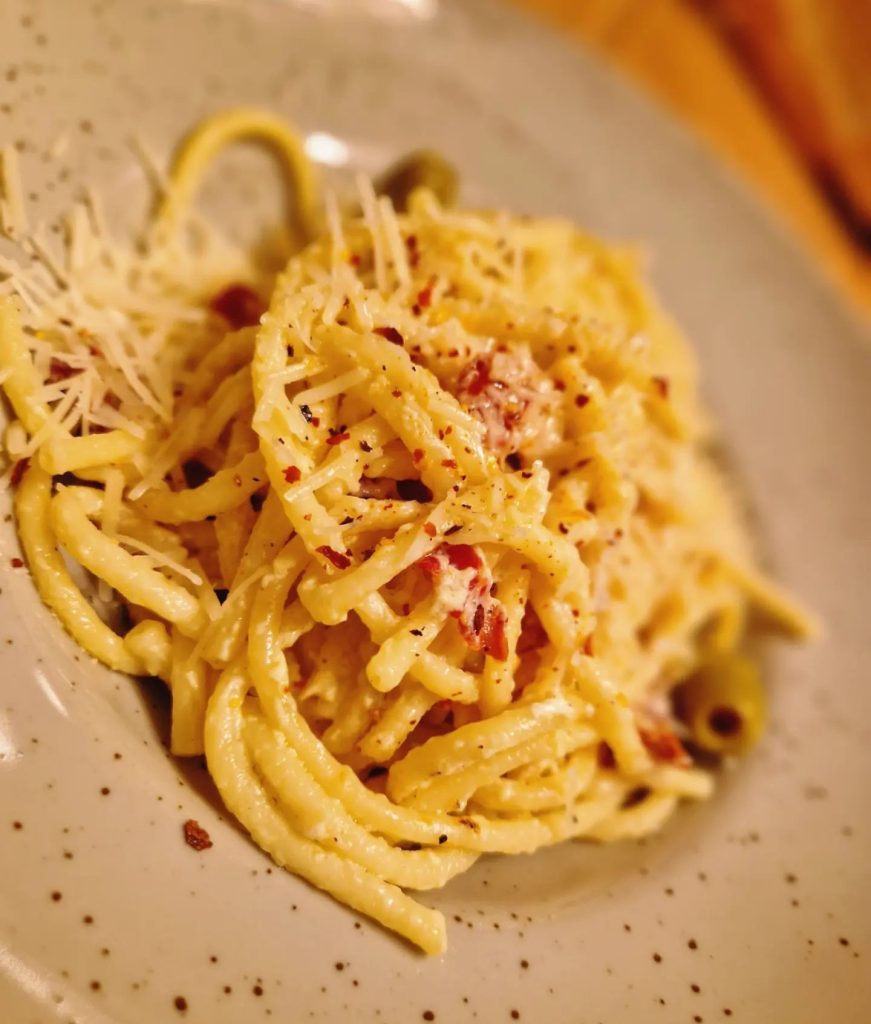 - Skär pancetta i små bitar. Stek gyllene i en stekpanna med olivolja. Vispa ihop äggulor och riven ost i en bunke tills blandningen är lite fluffig.
